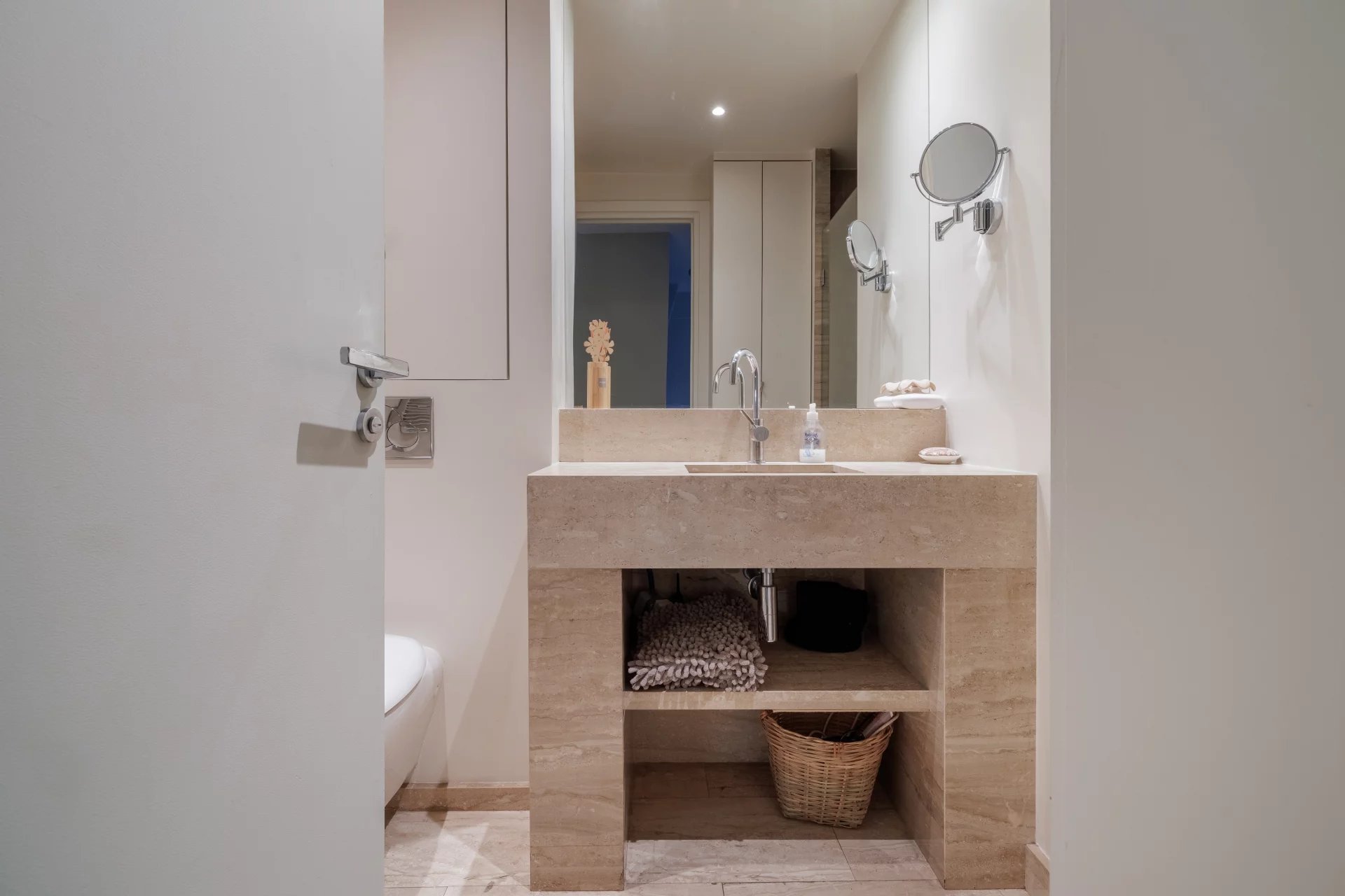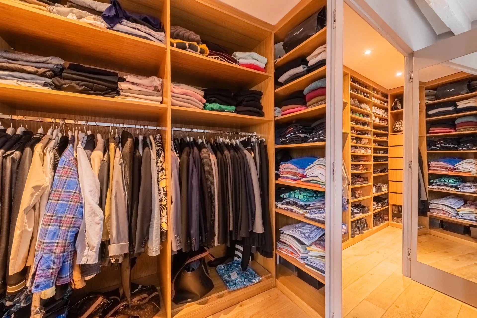 A stunning duplex featuring a beautiful living area and two large bedrooms with built-in storage upstairs,