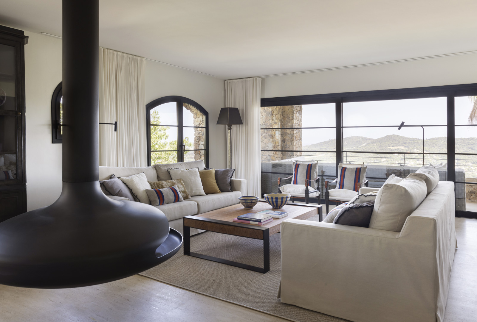 The property features natural stone walls, large open-plan interiors, floor-to-ceiling windows, and abundant natural light. The aesthetic is elegant and timeless, suitable for luxury lifestyle, wellness, fashion, technology, automotive, and family-oriented productions.